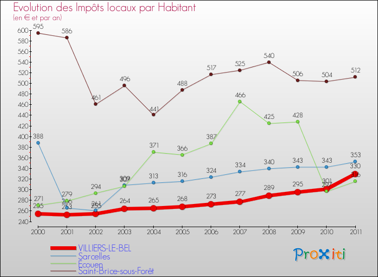 A Villiers-le-Bel, les impôts locaux par habitant ont donc augmentés de 29.41 % entre 2000 et 2011.