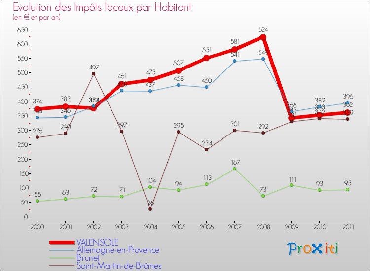 Pendant la même période, les communes françaises similaires à Valensole, ont vu leurs impôts locaux par habitant baisser de 7.22 % en moyenne entre 2000 et 2011.