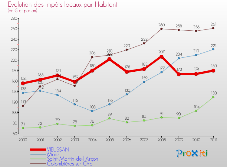 A Vieussan, les impôts locaux par habitant ont donc augmentés de 15.38 % entre 2000 et 2011.