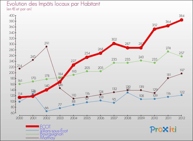 A Écot, les impôts locaux par habitant ont donc augmentés de 236.84 % entre 2000 et 2012.