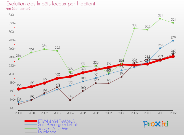 A Étival-lès-le-Mans, les impôts locaux par habitant ont donc augmentés de 46.67 % entre 2000 et 2012.