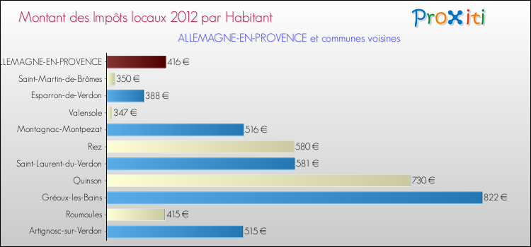 A Allemagne-en-Provence, en 2012 les impôts locaux par habitant sont donc plus élevés de 50.18 % que pour des communes similaires.