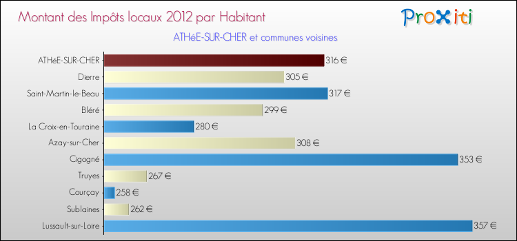 A noter : la valeur moyenne des impôts locaux dans les communes françaises similaires à Athée-sur-Cher était de 343 € par habitant, en 2012.