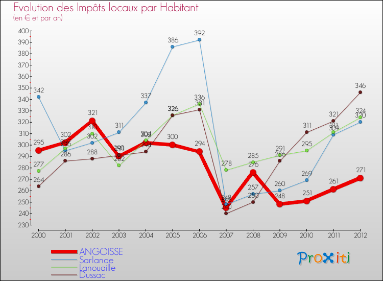 A noter : la valeur moyenne des impôts locaux dans les communes françaises similaires à Angoisse était de 277 € par habitant, en 2012.