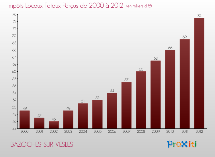 A Bazoches-sur-Vesles, les impôts locaux par habitant ont donc augmentés de 30.16 % entre 2000 et 2012.
