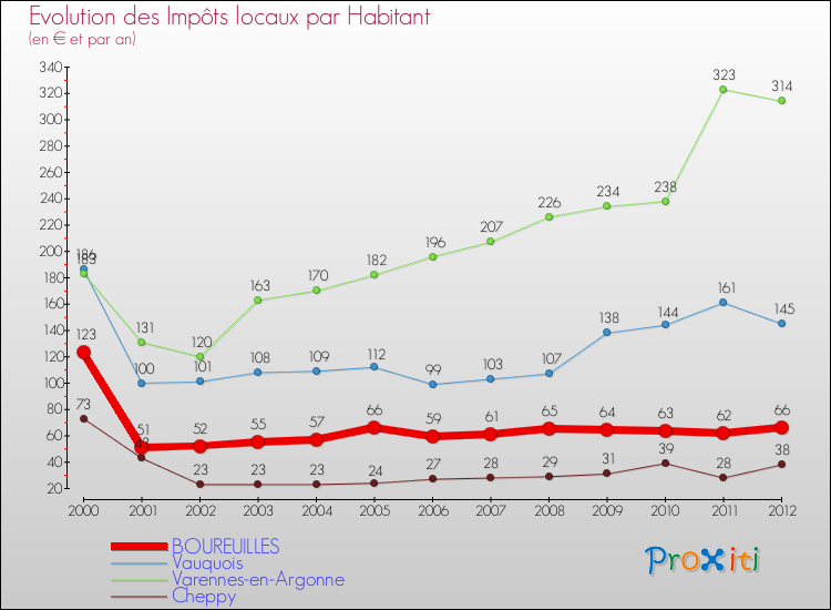 A Boureuilles, les impôts locaux par habitant ont donc baissés de 46.34 % entre 2000 et 2012.