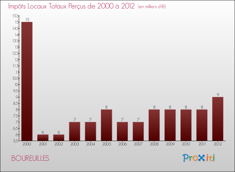 Evolution des Impôts Locaux perçus par la commune de BOUREUILLES de 2000 à 2012