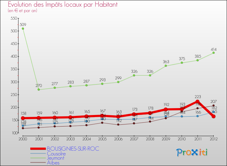 A Bousignies-sur-Roc, les impôts locaux par habitant ont donc augmentés de 4.43 % entre 2000 et 2012.