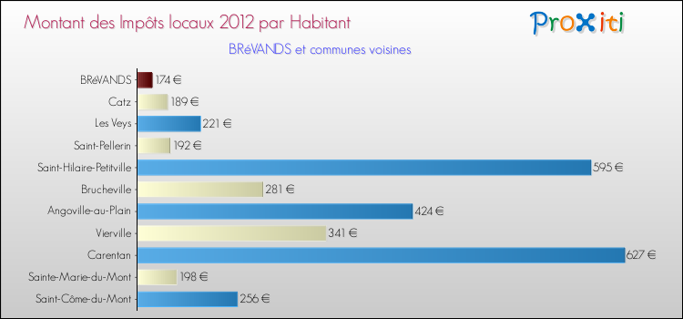A Brévands, en 2012 les impôts locaux par habitant sont donc plus bas de 36.03 % que pour des communes similaires.
