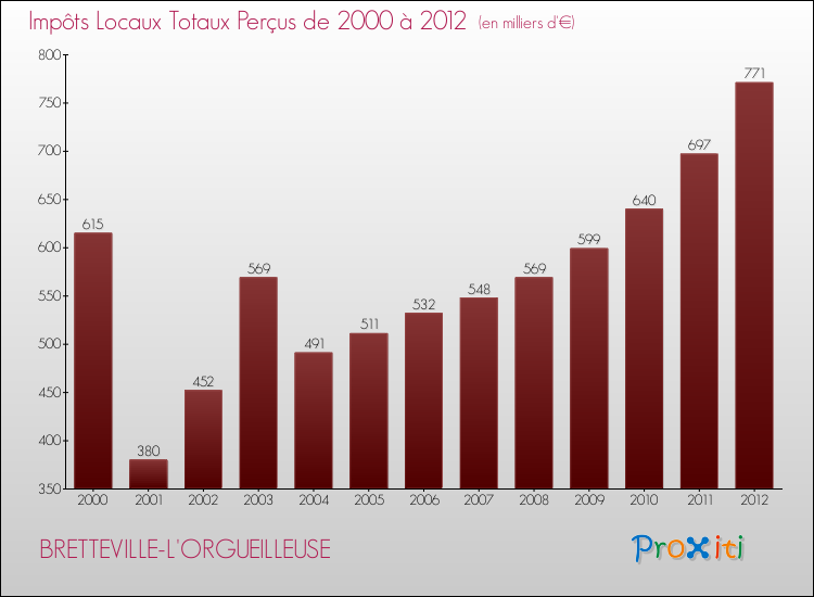 Evolution des Impôts Locaux perçus par la commune de BRETTEVILLE-L'ORGUEILLEUSE de 2000 à 2012
