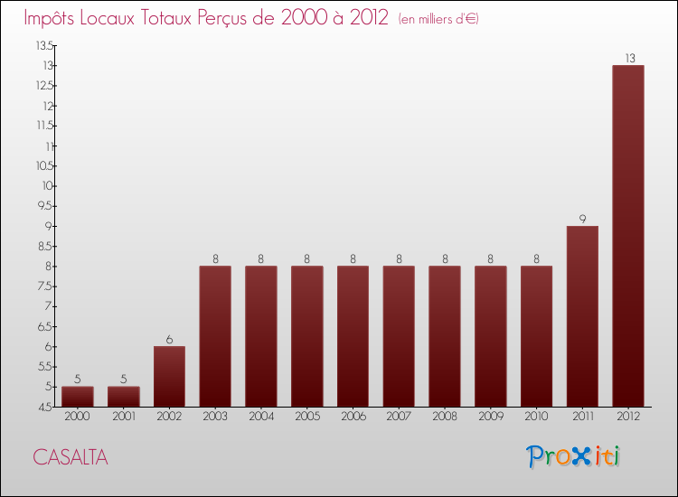 A Casalta, les impôts locaux par habitant ont donc augmentés de 77.21 % entre 2000 et 2012.