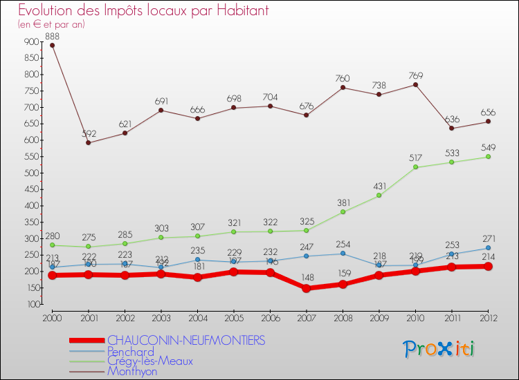 Le graphique ci dessous représente l'évolution des impôts locaux par habitant à Chauconin-Neufmontiers depuis 2000.