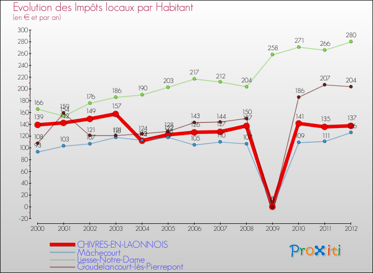 A Chivres-en-Laonnois, les impôts locaux par habitant ont donc baissés de 1.44 % entre 2000 et 2012.