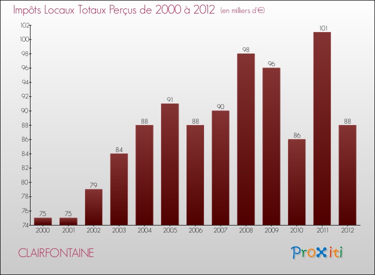 A Clairfontaine, les impôts locaux par habitant ont donc augmentés de 0.77 % entre 2000 et 2012.