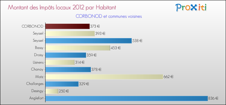 A noter : la valeur moyenne des impôts locaux dans les communes françaises similaires à Corbonod était de 345 € par habitant, en 2012.