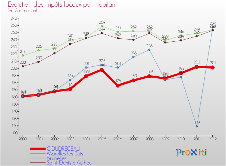 A Coudreceau, les impôts locaux par habitant ont donc augmentés de 24.84 % entre 2000 et 2012.
