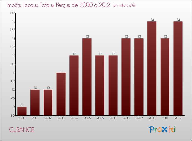Evolution des Impôts Locaux perçus par la commune de CUSANCE de 2000 à 2012
