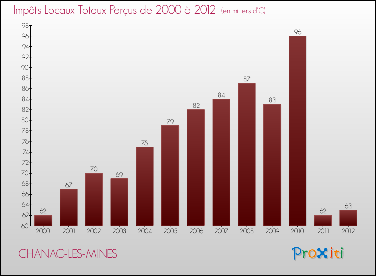 Evolution des Impôts Locaux perçus par la commune de CHANAC-LES-MINES de 2000 à 2012