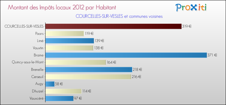A noter : la valeur moyenne des impôts locaux dans les communes françaises similaires à Courcelles-sur-Vesles était de 416 € par habitant, en 2012.