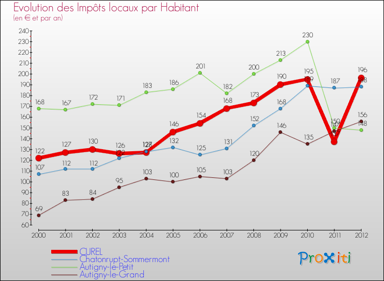 A Curel, les impôts locaux par habitant ont donc augmentés de 60.66 % entre 2000 et 2012.