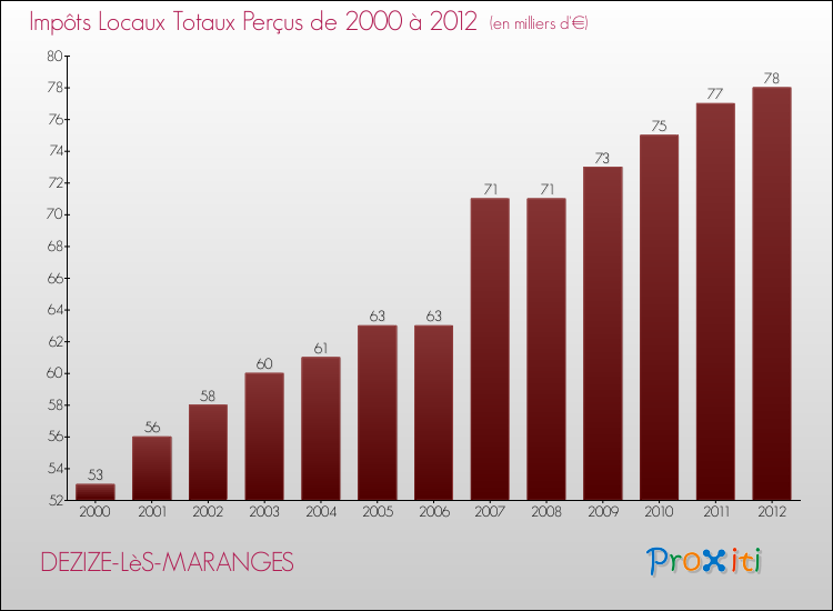 Evolution des Impôts Locaux perçus par la commune de DEZIZE-LèS-MARANGES de 2000 à 2012