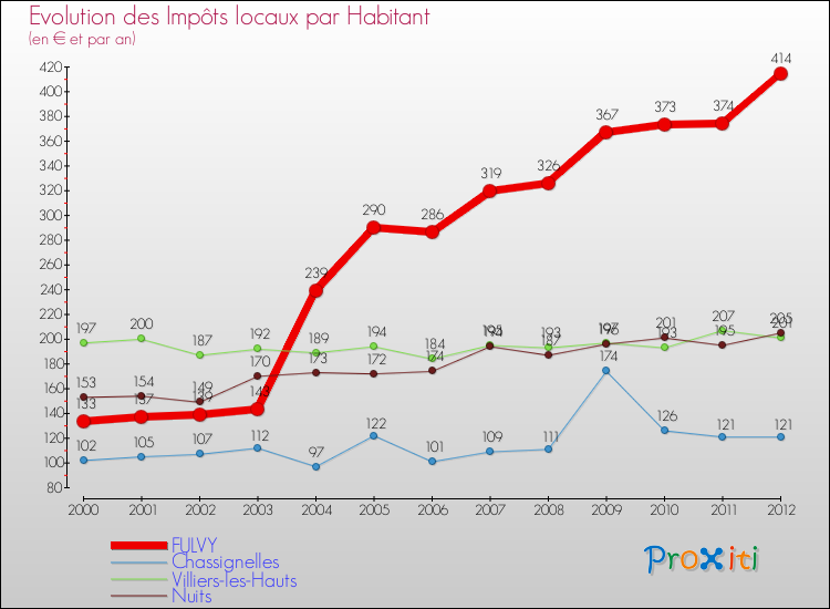 A Fulvy, les impôts locaux par habitant ont donc augmentés de 211.28 % entre 2000 et 2012.