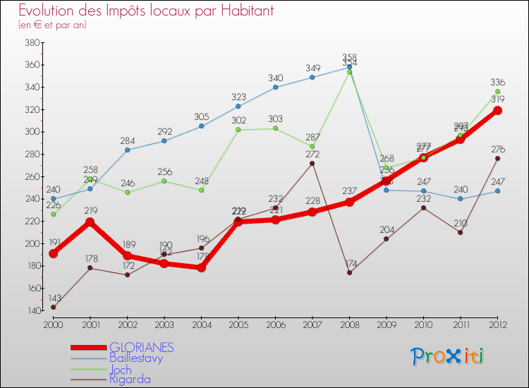 A Glorianes, les impôts locaux par habitant ont donc augmentés de 67.02 % entre 2000 et 2012.