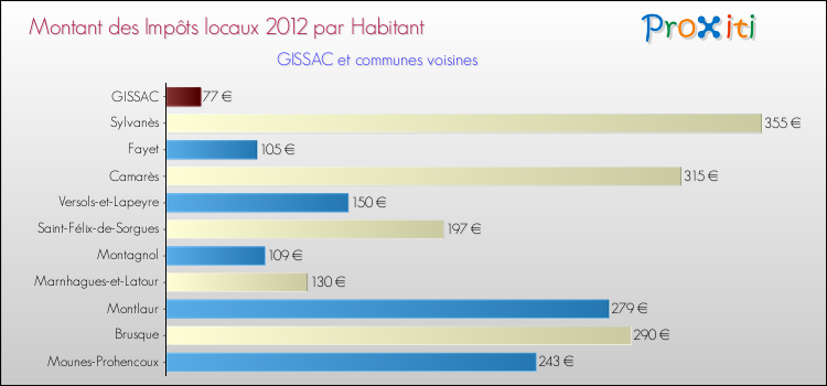 A Gissac, en 2012 les impôts locaux par habitant sont donc plus bas de 68.57 % que pour des communes similaires.