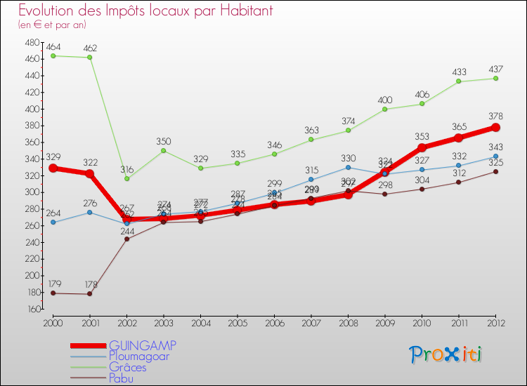 A Guingamp, les impôts locaux par habitant ont donc augmentés de 14.89 % entre 2000 et 2012.
