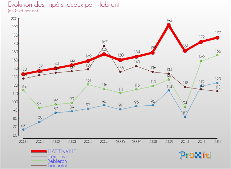 A Hattenville, les impôts locaux par habitant ont donc augmentés de 33.08 % entre 2000 et 2012.