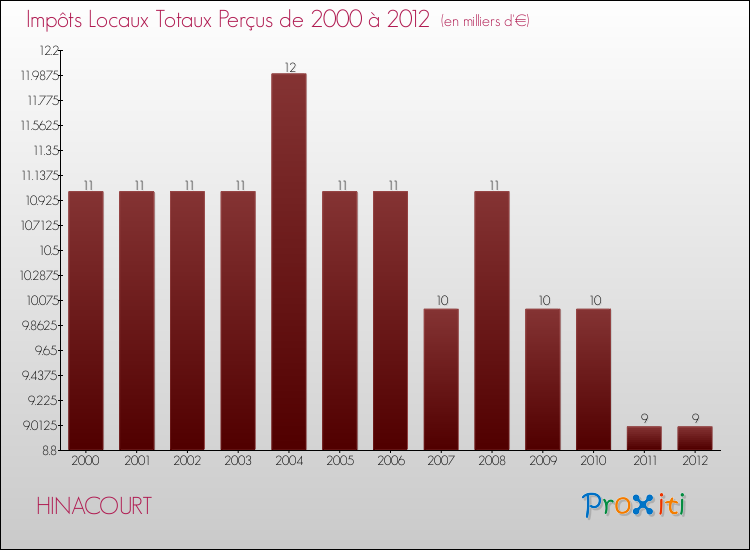 Evolution des Impôts Locaux perçus par la commune de HINACOURT de 2000 à 2012