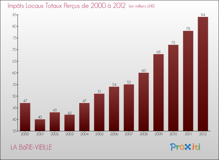 Evolution des Impôts Locaux perçus par la commune de LA BâTIE-VIEILLE de 2000 à 2012