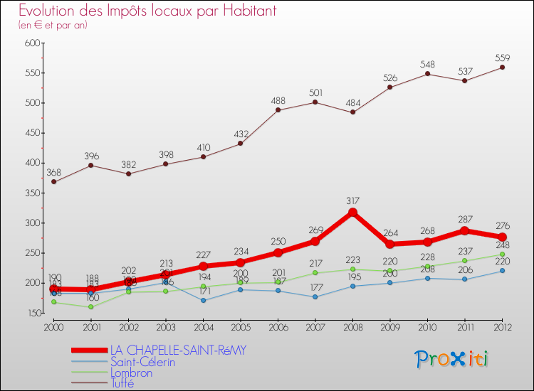 A La Chapelle-Saint-Rémy, les impôts locaux par habitant ont donc augmentés de 45.26 % entre 2000 et 2012.