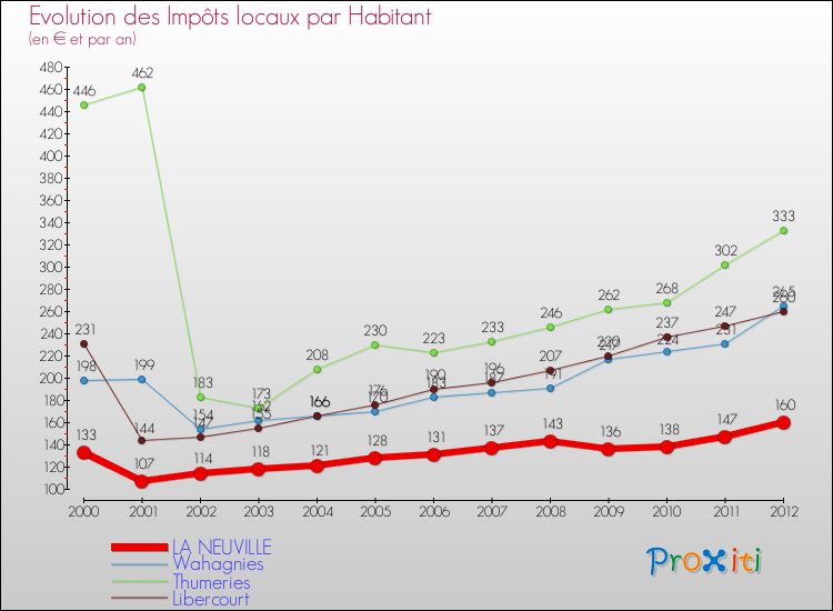 A La Neuville, les impôts locaux par habitant ont donc augmentés de 20.3 % entre 2000 et 2012.