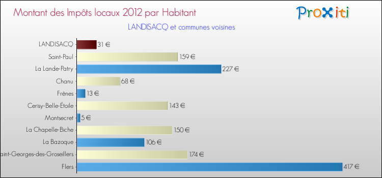 A Landisacq, en 2012 les impôts locaux par habitant sont donc plus bas de 91.01 % que pour des communes similaires.