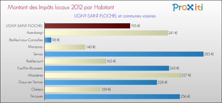 A Ligny-Saint-Flochel, en 2012 les impôts locaux par habitant sont donc plus bas de 21.37 % que pour des communes similaires.