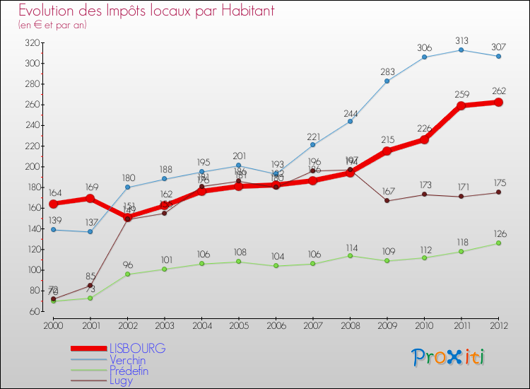 A Lisbourg, les impôts locaux par habitant ont donc augmentés de 59.76 % entre 2000 et 2012.