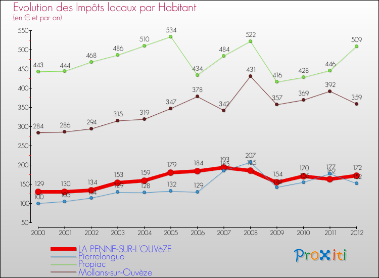 A La Penne-sur-l'Ouvèze, les impôts locaux par habitant ont donc augmentés de 33.33 % entre 2000 et 2012.