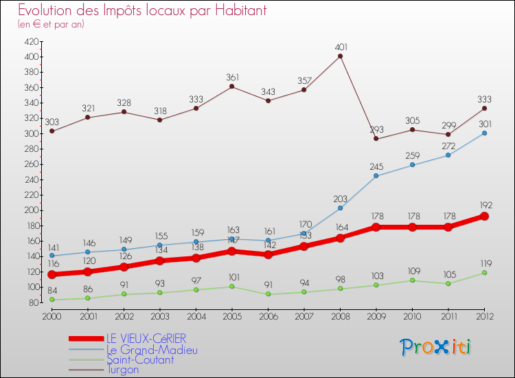 A Le Vieux-Cérier, les impôts locaux par habitant ont donc augmentés de 65.52 % entre 2000 et 2012.