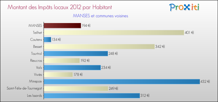 A noter : la valeur moyenne des impôts locaux dans les communes françaises similaires à Manses était de 248 € par habitant, en 2012.