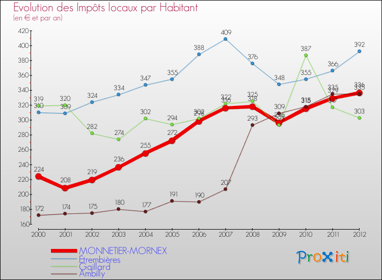 A Monnetier-Mornex, les impôts locaux par habitant ont augmentés de 5.66 % entre 2008 et 2012.