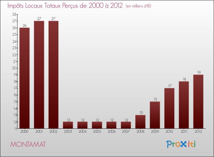 Evolution des Impôts Locaux perçus par la commune de MONTAMAT de 2000 à 2012