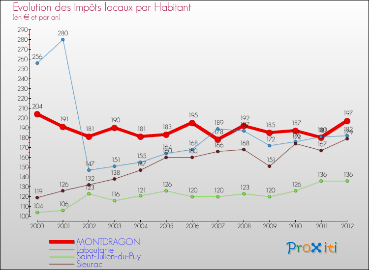 A Montdragon, les impôts locaux par habitant ont donc baissés de 3.43 % entre 2000 et 2012.
