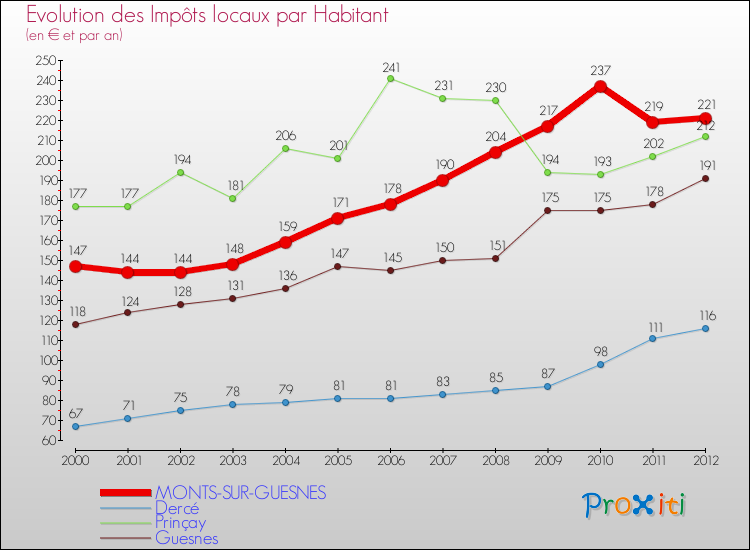 A Monts-sur-Guesnes, les impôts locaux par habitant ont donc augmentés de 50.34 % entre 2000 et 2012.