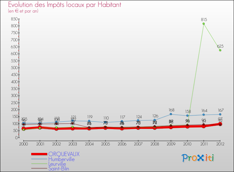 A Orquevaux, les impôts locaux par habitant ont donc augmentés de 53.97 % entre 2000 et 2012.