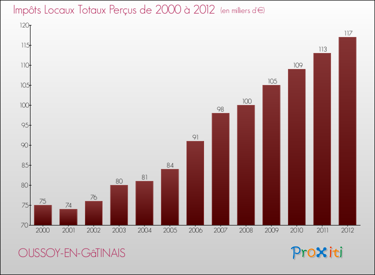 Evolution des Impôts Locaux perçus par la commune de OUSSOY-EN-GâTINAIS de 2000 à 2012