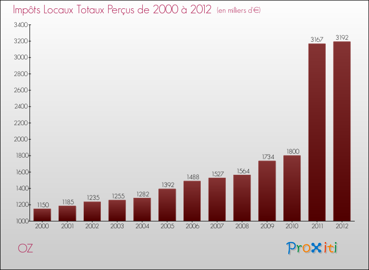 Evolution des Impôts Locaux perçus par la commune de OZ de 2000 à 2012