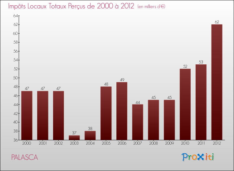 Evolution des Impôts Locaux perçus par la commune de PALASCA de 2000 à 2012