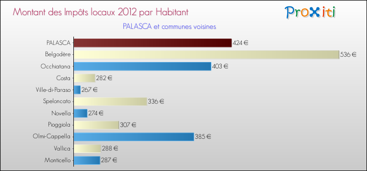 A Palasca, en 2012 les impôts locaux par habitant sont donc plus élevés de 73.06 % que pour des communes similaires.