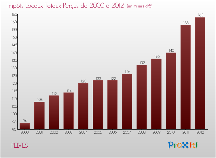 A Pelves, les impôts locaux par habitant ont donc augmentés de 73.08 % entre 2000 et 2012.